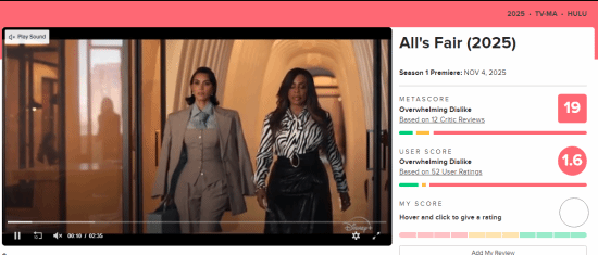 由瑞恩·墨菲創作,金·卡戴珊、娜奧米·沃茨、妮希·納什-貝茨、蒂安娜·泰勒、莎拉·保羅森等人主演的美國法律劇集《All's Fair》近日在Hulu首播,但收獲了評論界的一致差評,評論者主要批評其劇本薄