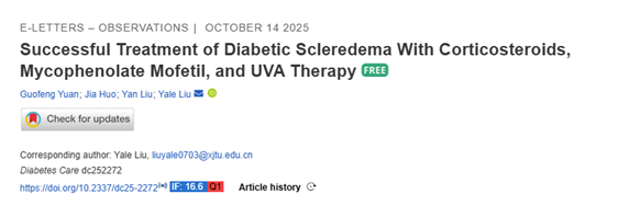 近日,西安交通大學第二附屬醫(yī)院皮膚科劉亞樂副研究員聯(lián)合霍佳教授和劉艷教授成功治療一例罕見糖尿病性硬腫癥。相關病例報告已發(fā)表于美國糖尿病協(xié)會官方期刊《DiabetesCare》,不僅展示出聯(lián)合療法在該病治療中的潛