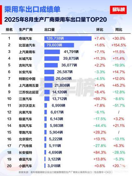 根據(jù)權(quán)威汽車媒體易車整理的出口數(shù)據(jù):8月,比亞迪在生產(chǎn)廠商乘用車出口量排名中以79603輛的成績位列第二,同比增長154.5%,增速排名第一。此外,8月共有五款車型躋身出口銷量榜前二十名,今年1-8月,比亞迪汽車累計出口量達601065