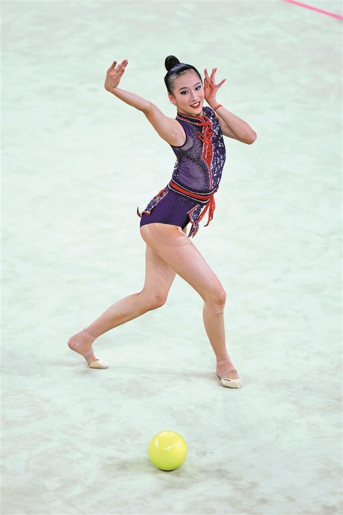 11月10日,王子露在球操比賽中。 本報記者 肖陽熠文/圖 腳尖起舞,彩帶飛旋。11月10日,最后一套動作音樂結束,王子露起身謝幕。 這位陜西藝術體操領軍者,經歷了兩個比賽日,共演繹8組成套動作,最終將總成績定格在