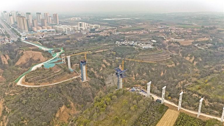 11月5日,在長武縣彭長公路鴉兒溝大橋項目建設現場,工人正操縱塔吊進行橋墩預制箱梁架設。
