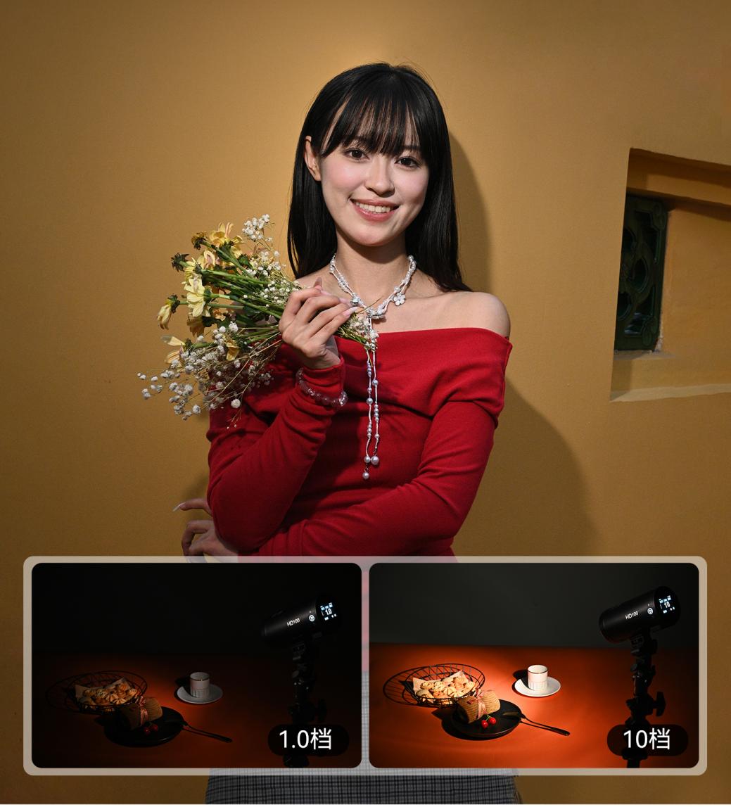 金貝HD100支持10檔的功率調節和0.1級微調,無論是近景特寫補光,還是遠景環境光填充,都能找到剛好的光線強度,實現 “想要多亮就多亮”。