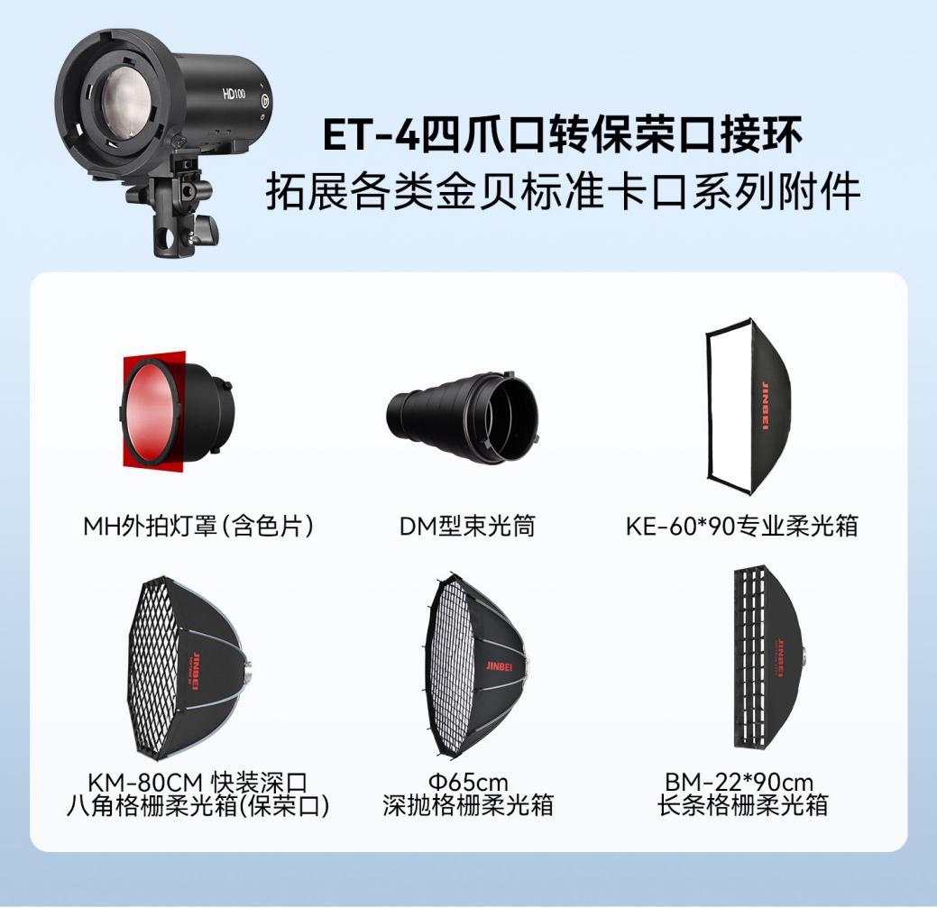 此外HD100外拍閃光燈采用了金貝迷你四爪附件卡口的設計,和HD2PLUS同樣兼容豐富的金貝快裝類塑光附件,省去了“專燈專用”的額外成本。還能通過附件轉保榮口支架,支持更多附件滿足多種需求。