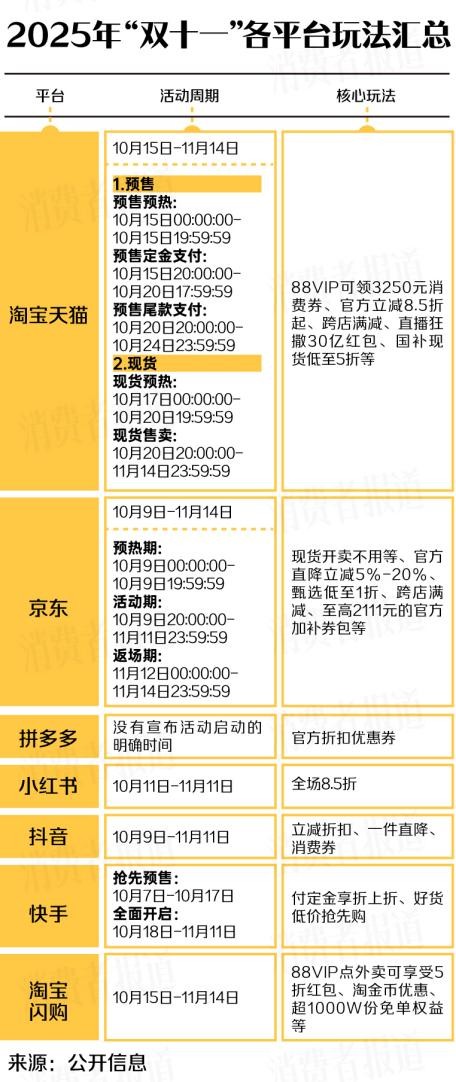 2025年雙十一不再局限于11月11日當天,而是拉長至一個月左右,京東從10月9日啟動,淘寶和天貓則從10月15日開始,分別持續37天和31天,覆蓋多個購物節點。