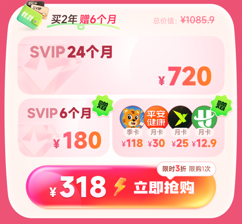SVIP雙年卡套餐:買1得5,加贈6個月超級會員及額外4項實用權益