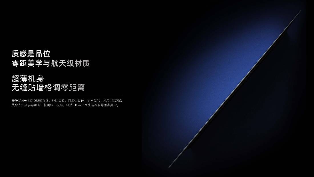 R10觀感系列不僅在功能上追求松弛,更在外觀設計上實現美學與實用的統一,讓電視成為家居風格的加分項。其采用四等邊設計與純平美背,機身厚度較傳統電視減薄20%,以≤60mm的超薄尺寸實現無縫貼墻效果。相較于普通藝術電視>120mm的“厚重小書包”機身,R10徹底打破了設備與墻面的視覺割裂感,無論是現代簡約風還是輕奢風家居,都能自然融入,營造電視即裝飾的格調。機身選用航天級鈦合金材質,集優質、美觀、耐用于一體,每一塊面板、每一條線條都彰顯高級感。內部搭載航發級涵道散熱系統,既保障設備長期穩定運行,又能有效省能省耗,兼顧顏值與實用性,讓用戶無需擔心設備易損壞、能耗高等問題,進一步強化使用松弛感。